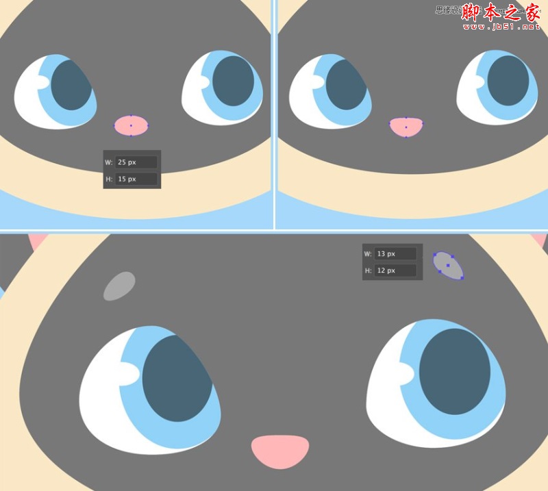 现在让我们画鼻子。制作一个25 x 15像素的浅粉色椭圆,并使用直接选择工具(A)重塑它,将其顶部和底部的锚点向下移动,使其看起来更像是一个圆形倒置三角形。