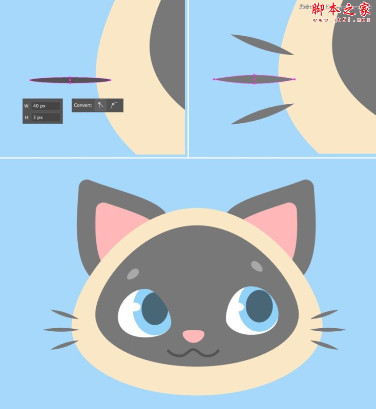 我们用椭圆工具(L)绘制胡须。做一个40 x 3像素的深灰色圆圈,使用直接选择工具(A)选择其侧面的锚点,并将选定的锚点从顶部的控制面板转换到角落,使得椭圆的尖端变得锋利。