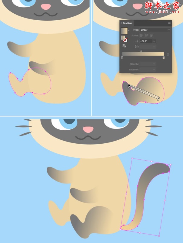 让我们将一个简单的线性渐变应用到爪子上,使小猫看起来更像一个连体。使用渐变面板(窗口>渐变)将深灰色的颜色应用于左侧滑块和渐变工具(G),以调整渐变的方向,使其与身体完美融合。