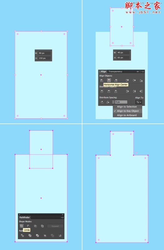 所以让我们创建一个90 x 150像素的浅蓝色矩形开始制作我们的瓶子。添加一个40 x 65像素的矩形,并将其放在第一个的顶部,形成瓶颈。