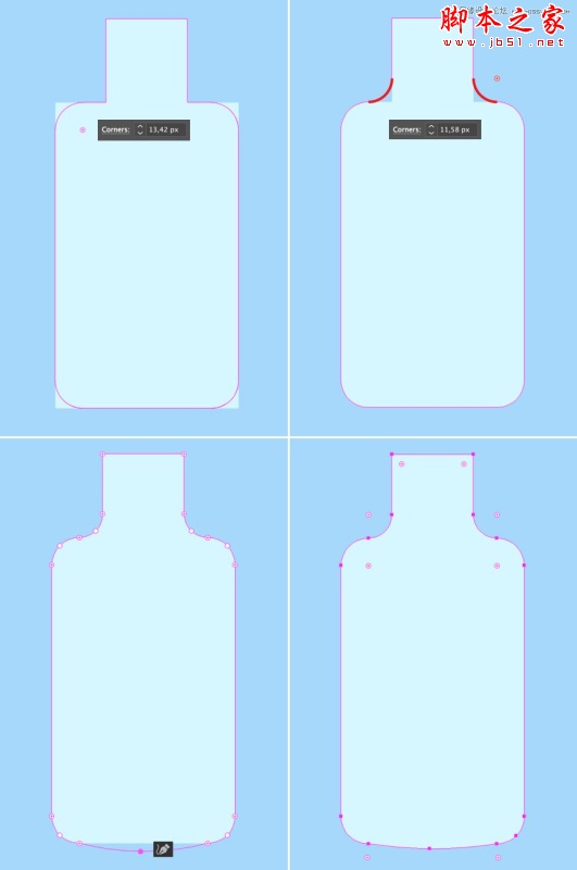 让我们用直接选择工具(A)选择瓶子的角落,并通过拉动活角的圆圈标记来让角变圆。 选择瓶身和瓶颈之间的内部角,并使其平滑。如果您喜欢圆形数字,您可以从顶部的控制面板调整角落半径。或者如果看起来不错,您可以将其保持原样。
