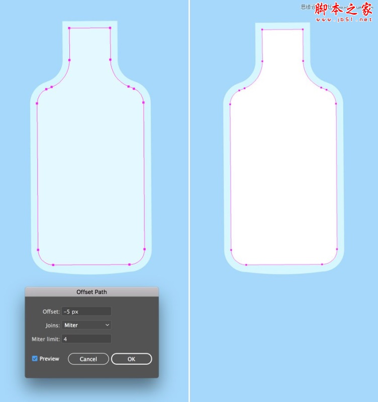 转到对象>路径>偏移路径,并将偏移值设置为-5 px,从而创建一个更小的内部轮廓。 用浅蓝色填充,使瓶子的玻璃边缘变厚。复制(Control-C> Control-F)新形状,并将副本填充白色的牛奶。