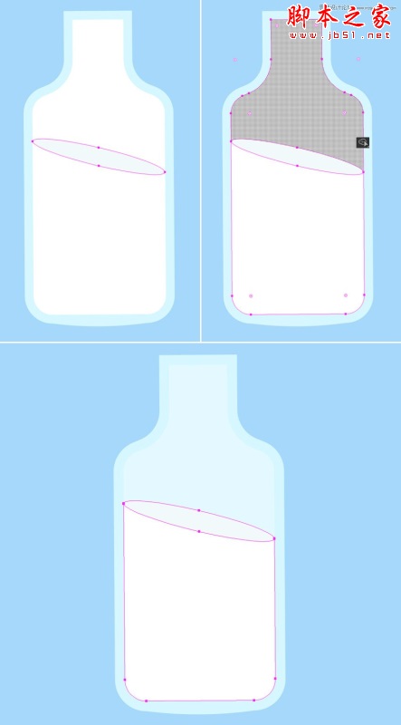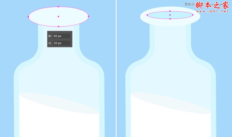 我们让瓶子半空!创建一个椭圆,旋转它,并调整大小,使其适合瓶子的内部。选择椭圆和牛奶形状。 现在抓住形状生成器工具(Shift-M),按住Alt键,一旦你看到鼠标光标旁边一个微小的减号,就将其悬停在牛奶形状的上半部分。 一旦它变成灰色,单击它,以删除这一块。太棒了!一半的牛奶消失了!