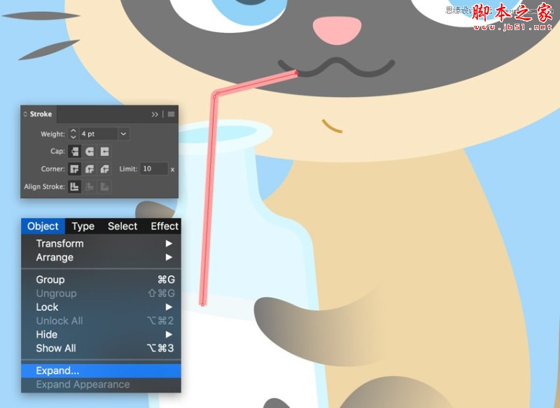 让我们添加一根吸管,使图像更细致。使用钢笔工具(P)绘制一条折线。在颜色面板中为描边应用粉红色。然后打开描边面板,将粗细设置为4pt,使吸管变厚。