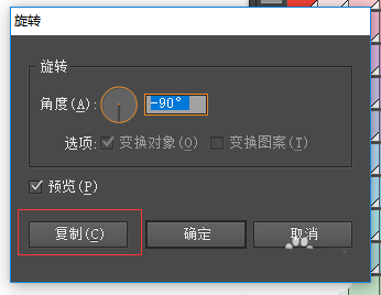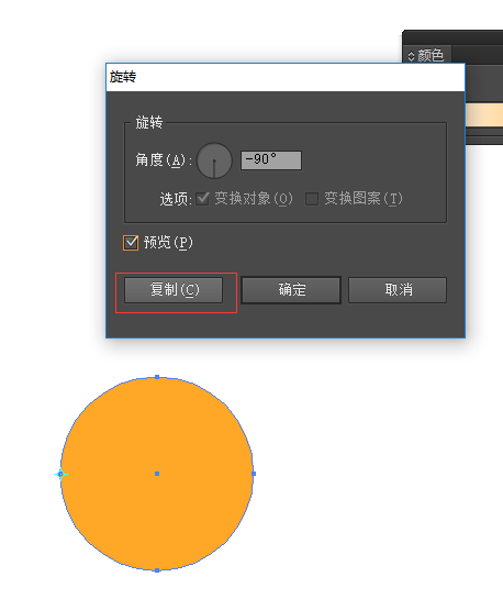4、点击旋转工具,按着Alt键拖动中心点到下方锚点,角度:-90°,复制,换一个颜色方便查看;