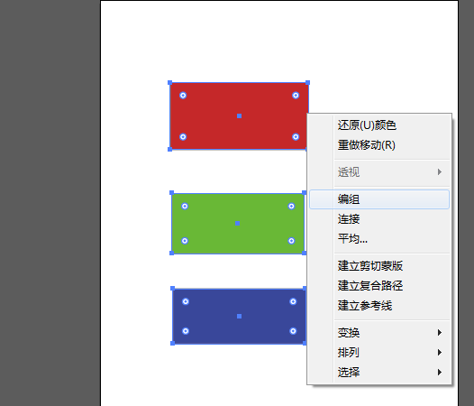6、下面我们选择三个矩形,然后右键选择"编组",再点击"选择工具",就拖动整个组移动,大概就是"选择工具"是针对一个对象整体或一个编组进行操作的,如图所示;