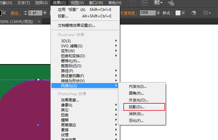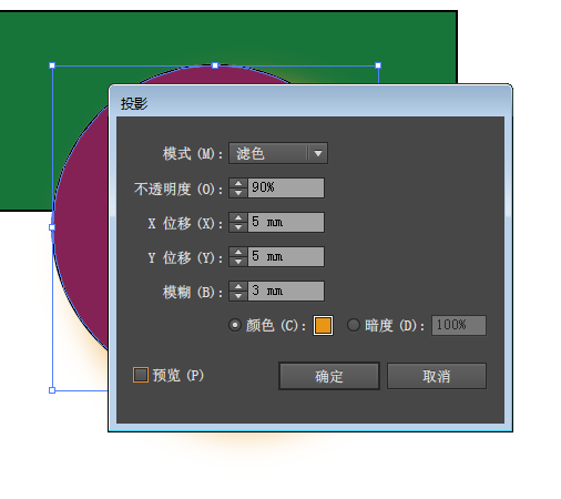4、下面我们选择圆形,再点击"效果/风格化/投影",填写相应的参数,如图所示;