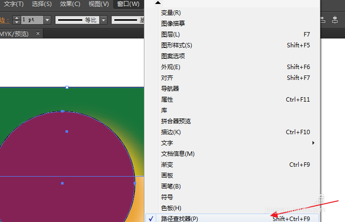 5、然后我们选择矩形和圆,点击"窗口/路径查找器",我们点击路径查找器下的"分割",如图所示;