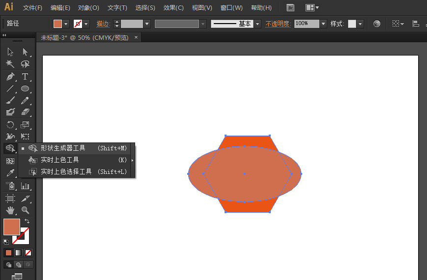 2、选中这个椭圆和正六边形的组合图形,然后在界面左侧的工具栏中,请选择“形状生成器工具”