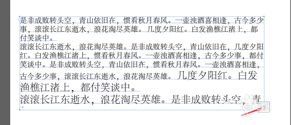4、这就是最简单的文件的编辑,接下来我们学习一下‘段落文字’我们选中【文字工具】,按下去不松手,直接进行拖拽,这样就会形成一个文本框,在新版本里会有字填充,如果是老的版本需要自复制文字