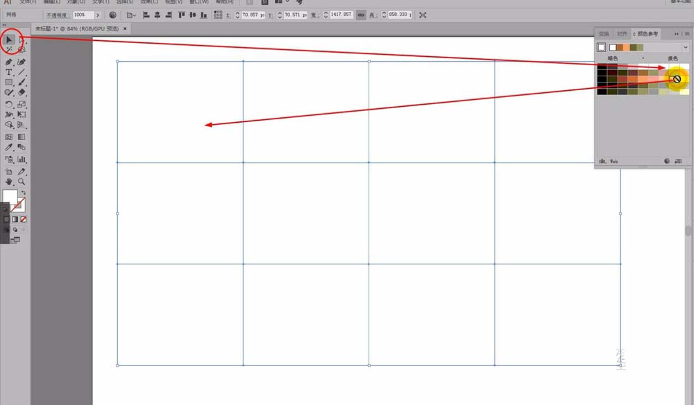 3、选择工具栏的,网格工具,如图,点击网格锚点,然后在颜色面板(窗口-颜色,快捷键F6)可以如图输入一个颜色值,也可以直接在点击里面的颜色,然后锚点部分的颜色就更该了,其他的锚点也可以这样操作,增加锚点,双击一下鼠标就可以了,如图显示