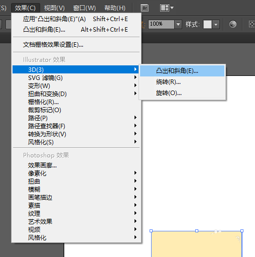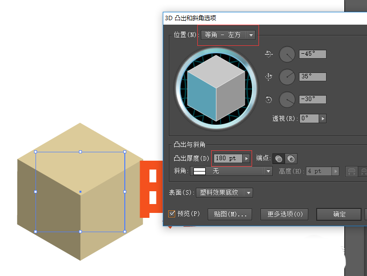 3、将文字先放在一边,选中矩形, 点击“效果-3D-凸出和斜角”,位置为:等角-左方,凸出厚度:180pt,其他默认,点击确定。然后再点击“对象-扩展外观”,得到最后的立体方块;