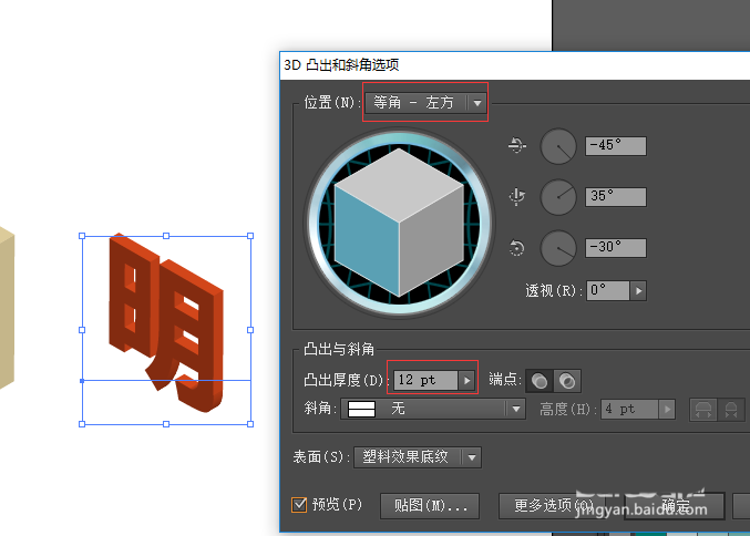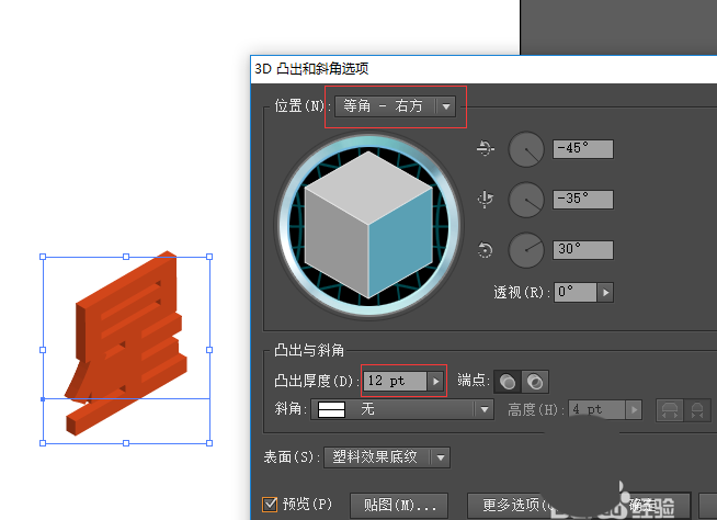 5、选中右边的文字,设置位置为:等角-右方,凸出厚度:12pt(可根据需要设置大小),其他默认,点击确定,扩展外观后放置在方块的右侧;