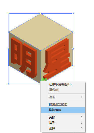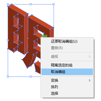 7、然后选择左边的文字,右键取消编组两次,根据明暗关系,为每个面填充上不同的颜色;