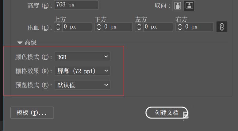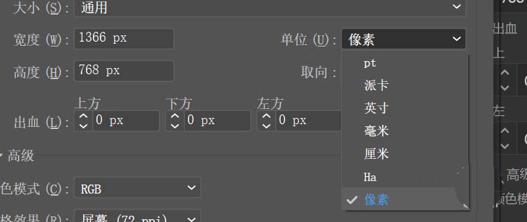 8、在大小的下边有画布的宽高,有些人就会问为什么我已经选了画布的大小怎么又设置画布的宽高呢?其实在工作中有些画布的大小是要根据实际情况来定的,要注意的是,在设置的时候一定要设置好画布的‘单位’