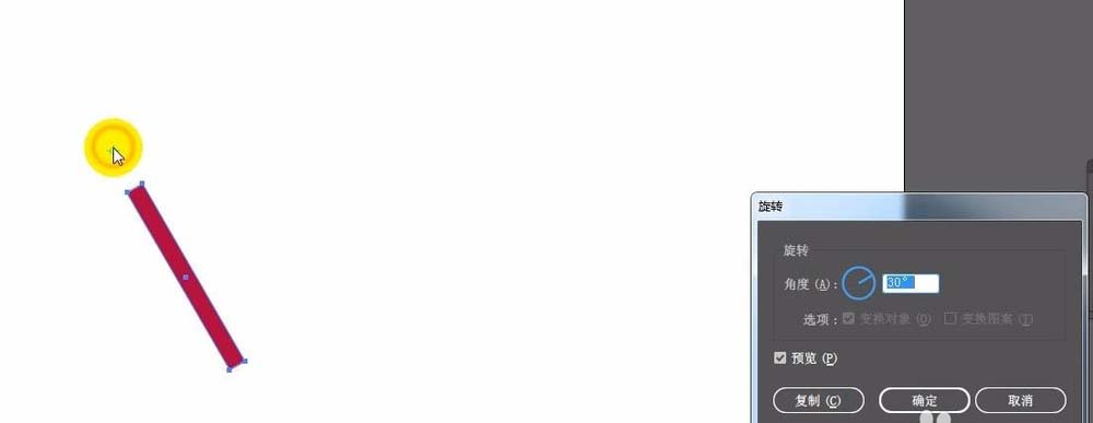 4、关键点来了,这一步是移动旋转中心。按住键盘的ALT键,鼠标点击页面,点在什么位置,就会将旋转中心移动到这个位置。(注意按住ALT键),点击后,移动了旋转中心点,并且一点击会弹出旋转的对话框,可以设置一个旋转角度,角度随意
