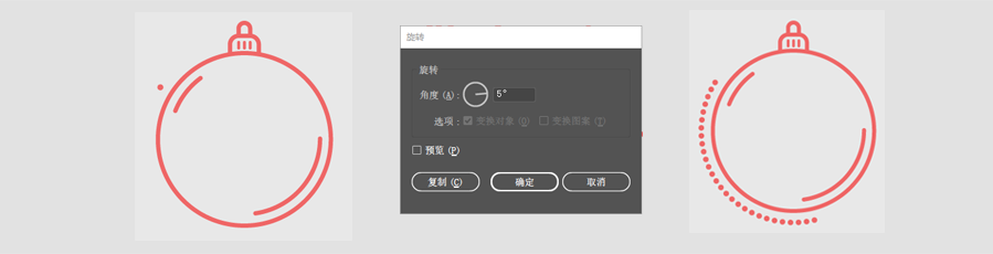 首先选择工具选中要旋转的红色小点,再选择旋转工具,快捷键为R。按住Alt键,把圆点的中心点移动到大圆的中心。设置旋转角度为5,点击“复制”。按“ctrl+D”进行重复复制,复制到一半就行,因为我们要的只是一部分。