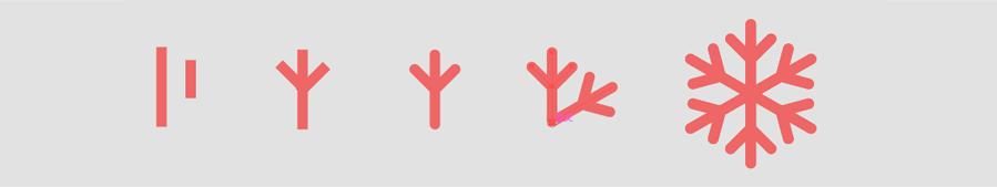 用直线段工具分别绘制两条长度10px,5px,角度为90度,描边1.5pt的两条线段,将短的那条线段向右旋转45度,然后对称过来进行编组,记得将端点改为圆角端点,这样雪花枝丫做好了。
