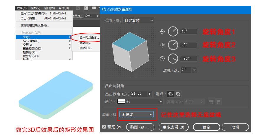 步骤1:打开AI新建一个800*600的画布。建一个206*338的矩形,圆角大小为26。填充的颜色随意,反正都是要在PS里上色的。选中这个矩形后选择效果—3D—凸出和斜角。设置数值如下图: