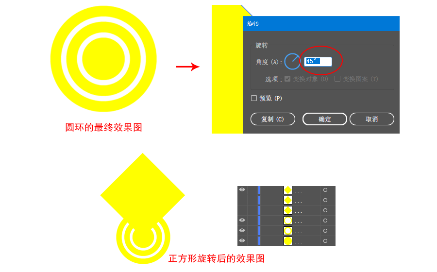 ⑦显示另外一个组,再将这两个圆制作成一个圆环。底圆缩放70%顶圆缩放50%。最后显示中间的实心圆缩放比例40%,最终效果图如下。再绘制一个100*100的正方形,底端点和圆环中心点对齐;将这个正方形旋转45°后复制两层,同样只显示一个正方形。