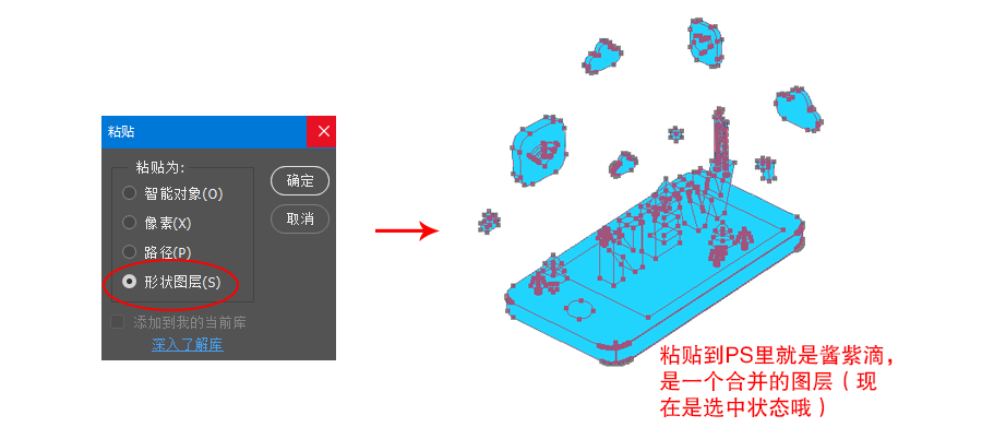 步骤1:确保AI里做了3D效果的图形全部都扩展外观了后。直接选择工具选中所有图形后按Ctrl+C,跳转到PS中后按Ctrl+V,这时会有个对话框,选择形状图层即可。然后开始进行最考验耐心的一步啦路径选择工具选中每一个小块后按Shift+Ctrl+J即可将每一小块作为一个单独的图层提取出来。
