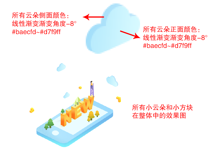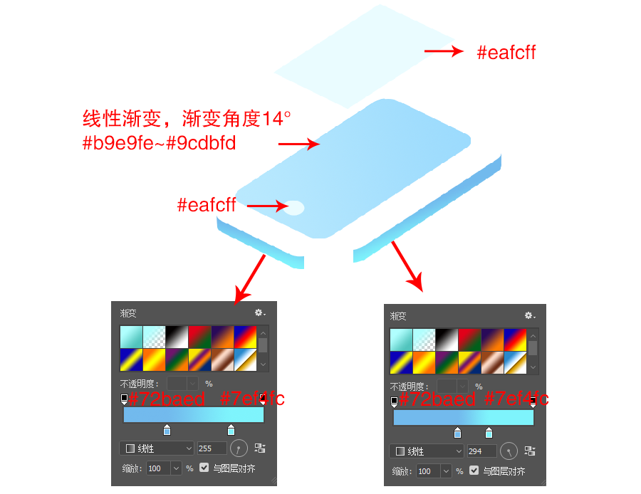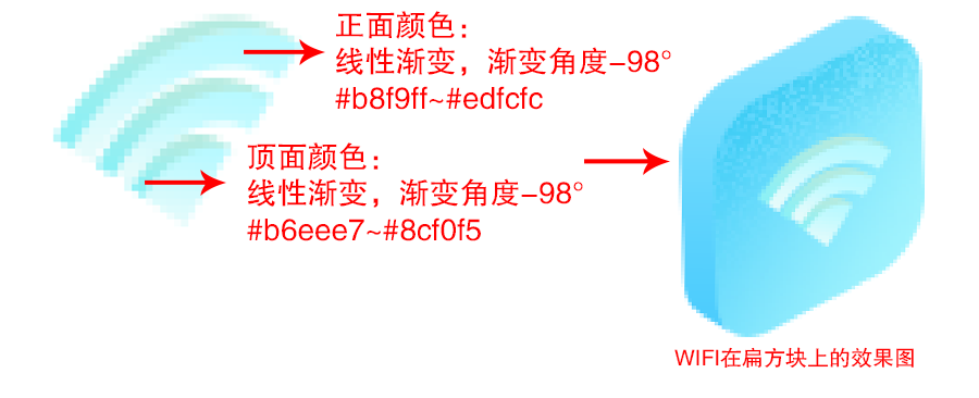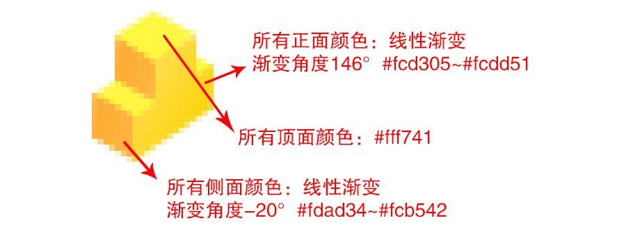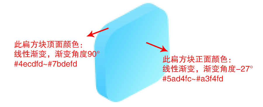 ②顶面上色,蓝色箭头指的色块需添加渐变色并整体降低不透明度 至80%。