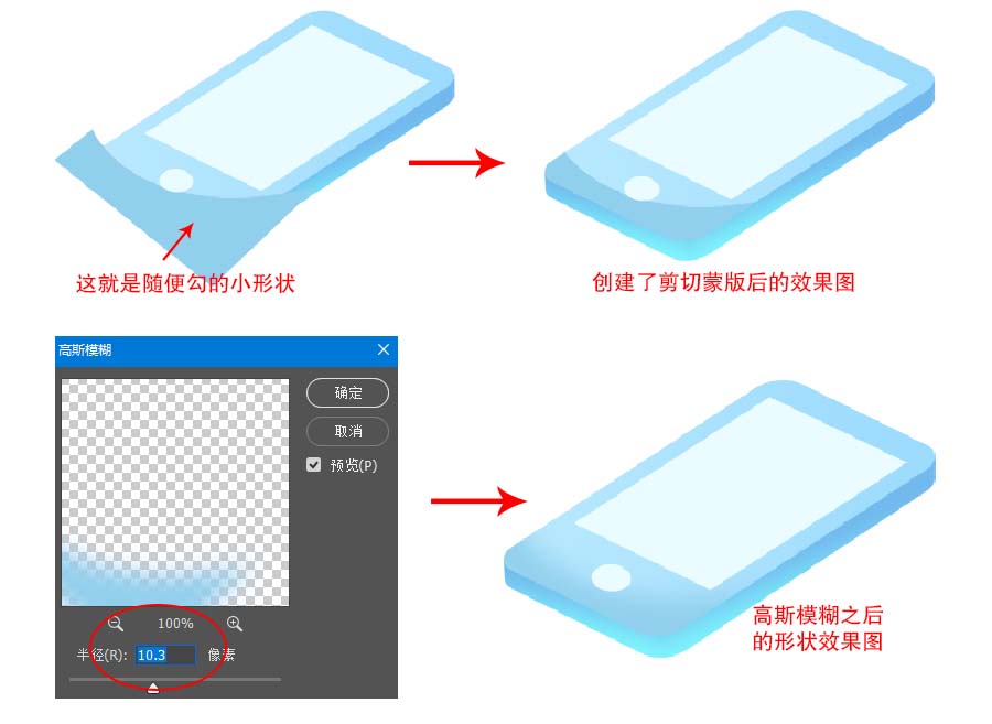 ②再添加杂色。随便勾一个形状放在渐变角度为14°的矩形上面, 填充颜色#91d0ed后添加剪切蒙版,转换成智能对象之后滤镜— 模糊—高斯模糊。