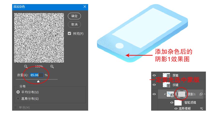 ③给这个形状图层命名为阴影1,然后再给这个图层加个蒙版,选中蒙版后选择滤镜—杂色—添加杂色,设置参数如下。再将阴影1的不透明度降低至80%。