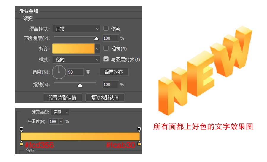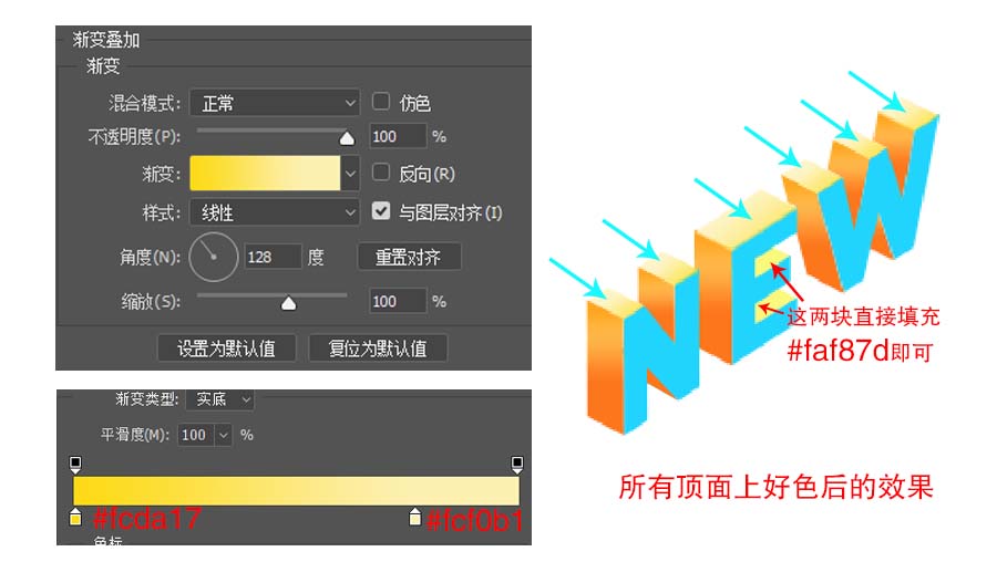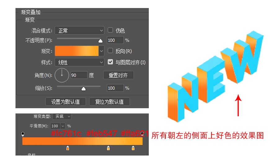 步骤4:再给NEW字母上色,每一个操左的侧面颜色都是一样的,朝右的侧面颜色也是一样的,最后正面的颜色也是一样的。现在上色的方式是通过加图层样式的渐变叠加实现的。三个面的颜色分解图如下: