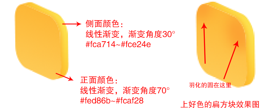 ①先给方形底座上色。上完色后画两个圆,大小随意,填充#fca2 32,然后再羽化一下,羽化值是根据圆的大小来的哦。