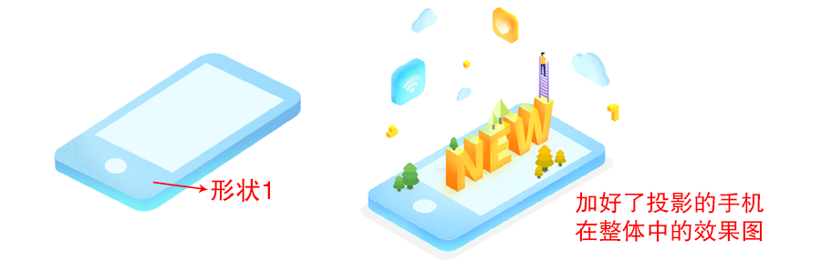 步骤10:最后再给手机加个投影,将形状1(见图中红箭头指的形状)复制一层放后调整一下大小放在在手机底下,颜色改成#f2f4f4。