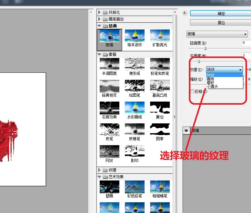8、进入效果画廊界面,选择扭曲功能组后,选择玻璃样式。