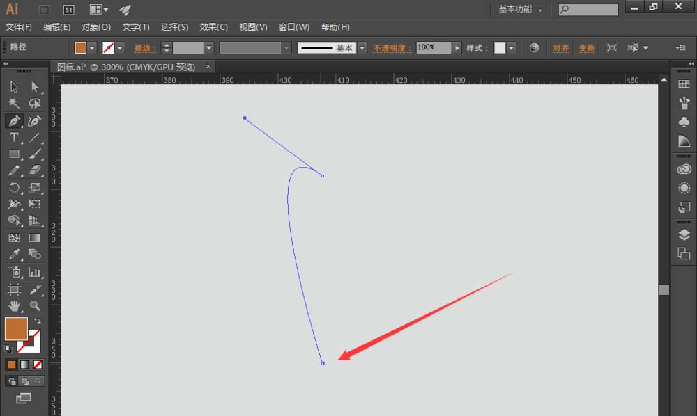2、使用【钢笔工具】在文档中单击拖拽,调出锚点的两个手柄,如图所示: