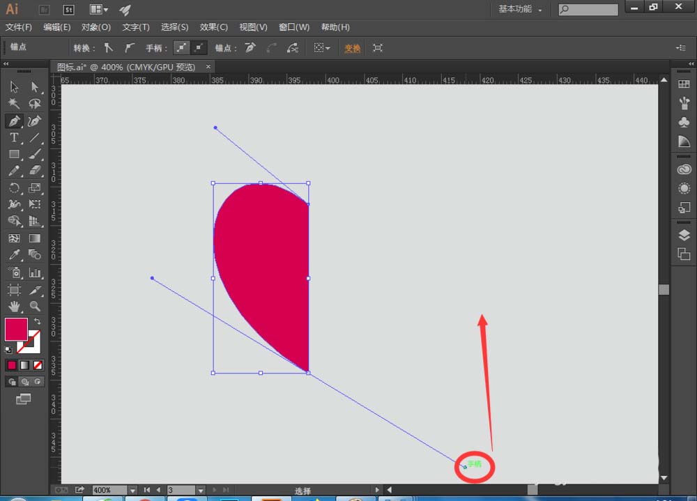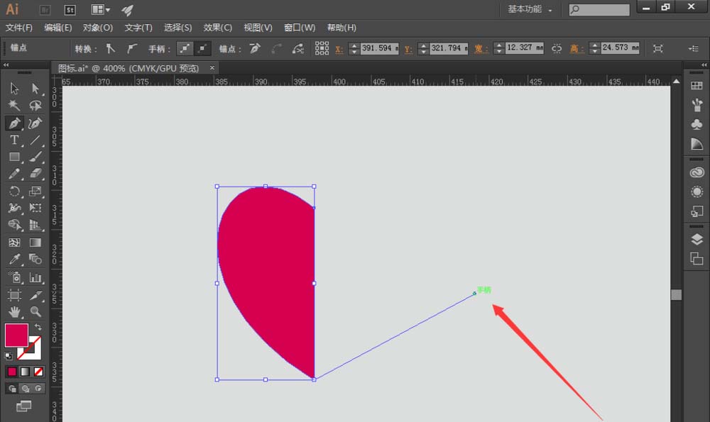 6、使用【直接选择】工具,点击锚点,调出锚点的两个手柄,通过拖动手柄对图形进行相应的调整,如图所示: