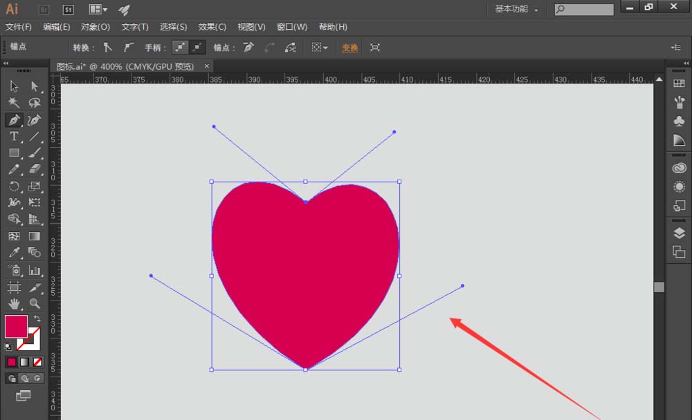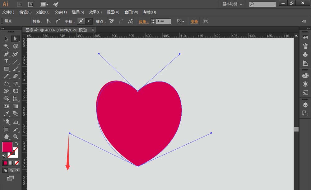 7、如果心形的下方太尖的话,也可以通过直接选择工具来将其调成圆滑的。如图所示: