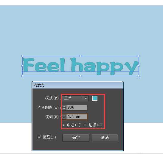 3、在弹出的内发光面板中,设置模式为正常,不透明度为90%,模糊为0.1cm,这个数值可以自行调整