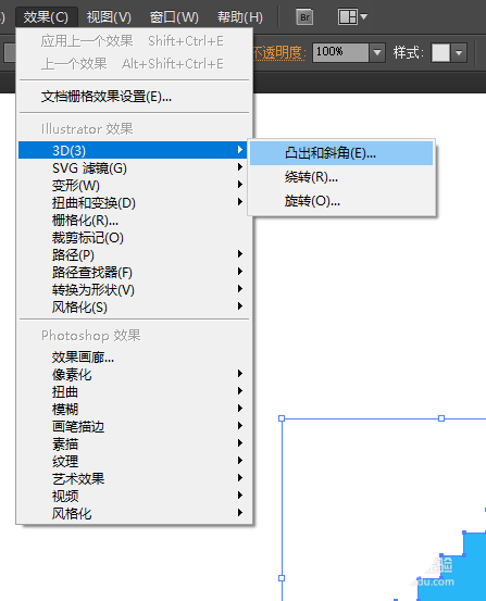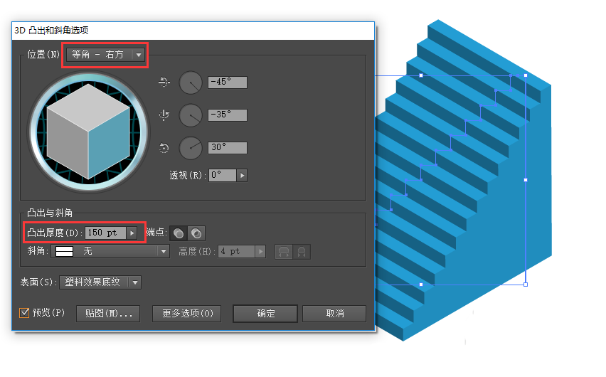 4、选中图形,点击“效果-3D-凸出和斜角”,位置:等角-右方,凸出厚度:150pt(可根据需要调整),其他默认,确定;