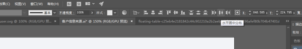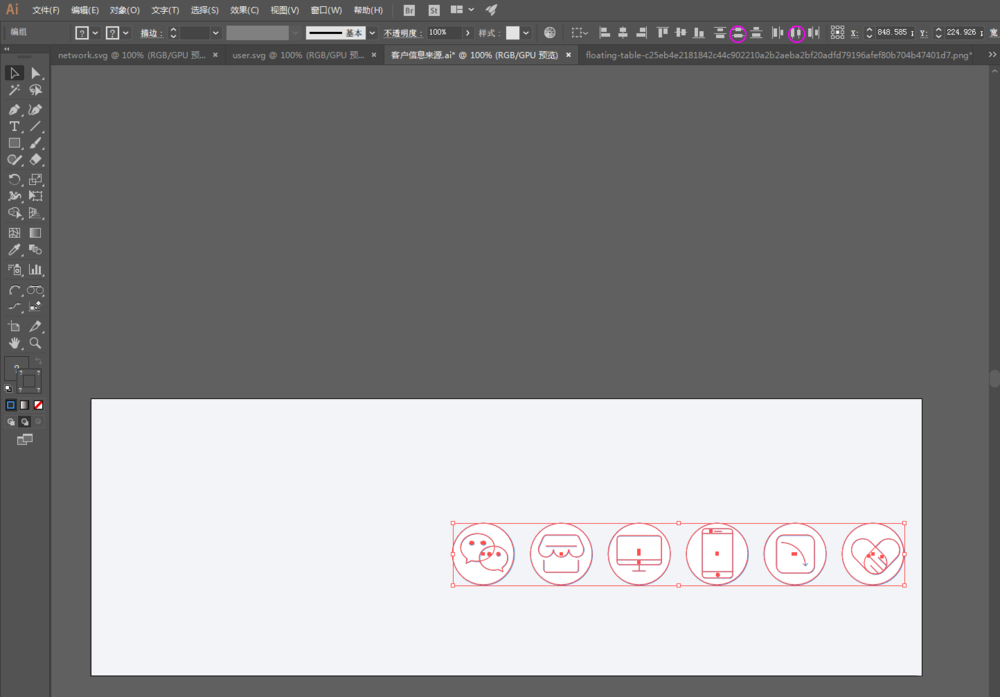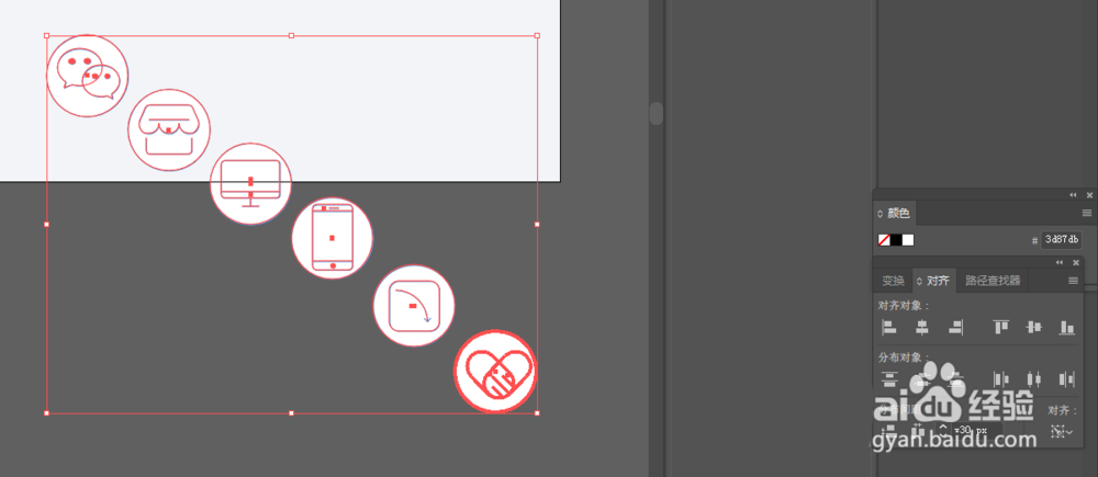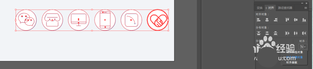 4、虽然图标也对齐了,但是以画板为基准两侧对齐,水平和垂直居中分布,这并不是我们需要的效果