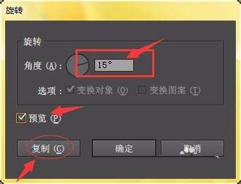 5、会弹出一格调整框,输入旋转角度,选中预览,观看实时效果,然后点击复制