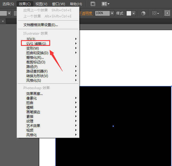 5、点击效果菜单在其下拉菜单里找到SVG滤镜选项,如图所示: