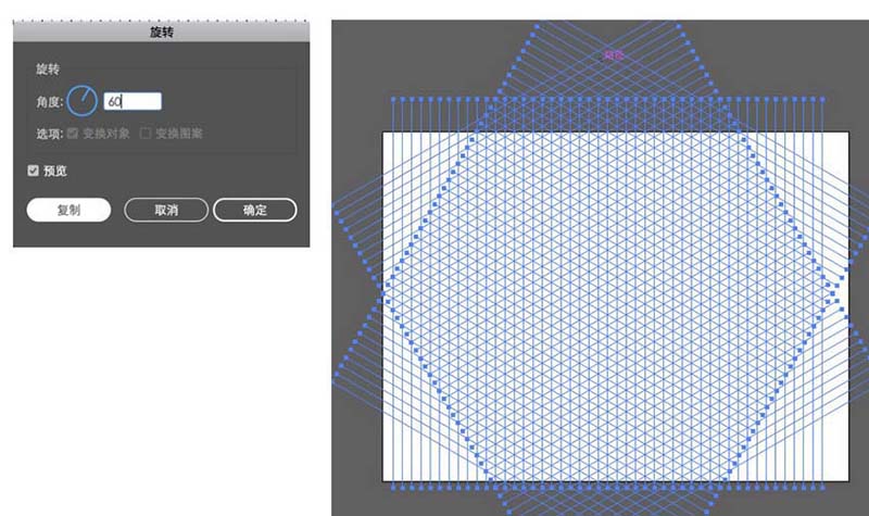 4.用小黑工具,框选画好的所有直线,按住r+enter,会弹出下图窗口,角度改为60度,然后点击复制,然后再重复按住r+enter,参数跟刚才一样,再复制一次,参考线就做好啦,效果如下图;