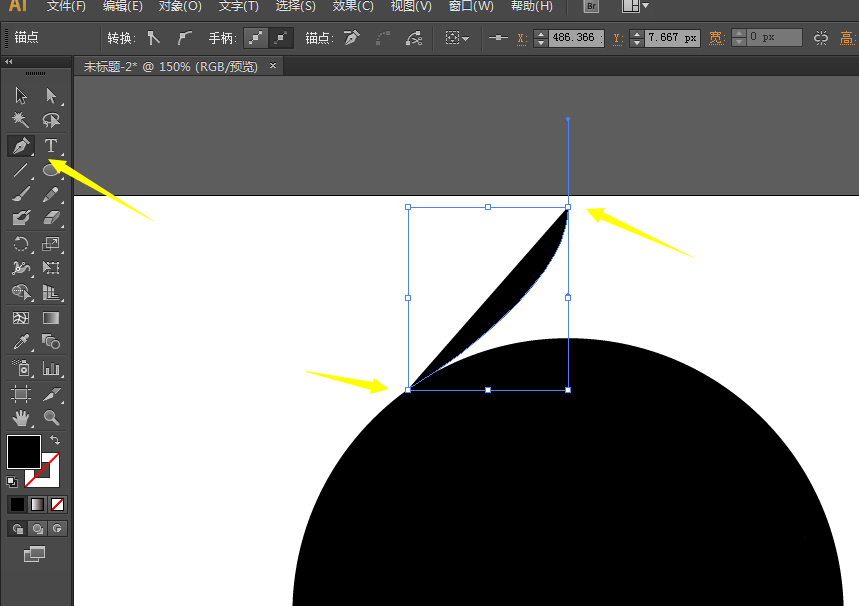 3、点击钢笔工具,在图上的位置点击并且画一条曲线,画完以后按住ALT+鼠标左键转换锚点,然后继续画,这样就画成一个有弧度的三角形。