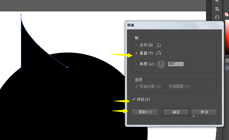 4、选择镜像,参数选垂直,点击复制,就可以得到另一边的弧度三角形。调整一下位置得到水滴的最初形状。