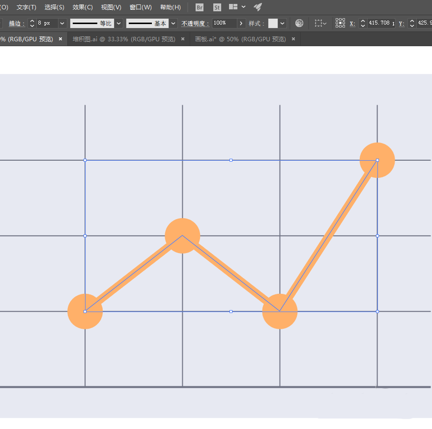 5、用钢笔工具绘制折线,把圆形连接起来形成基础的折线图,【对象】-【路径】-【轮廓化描边】,生成闭合的图形。