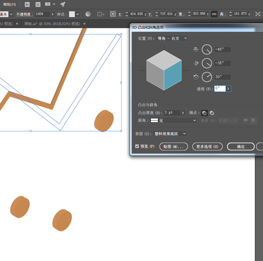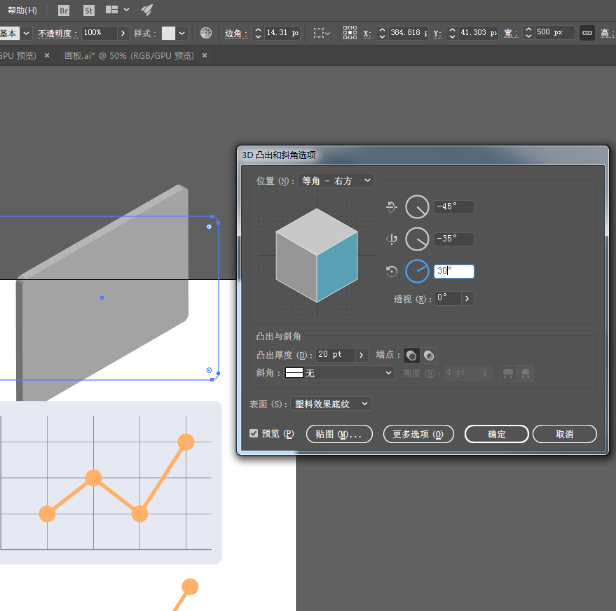 8、选中最开始绘制的简单的圆角矩形,【效果】-【3D(3)】-【凸出和斜角】,在面板中设置位置【等角-右方】,厚度减少一些。