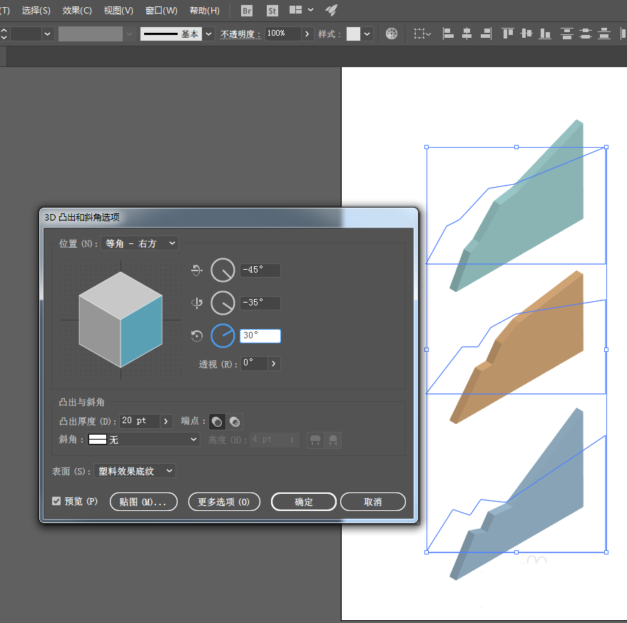 2、三个图形同时选中,不要编组,【效果】-【3D(3)】-【凸出和斜角】,在面板中调整参数,位置【等角-右方】,调整凸出厚度。