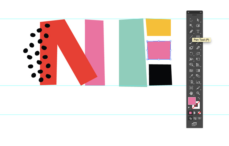 步骤10:接下来是下一个单词“NEW”,这时我们需要使用第二行的辅助线了。使用钢笔工具绘制字母“N”的两个笔划,并填充为番茄红。