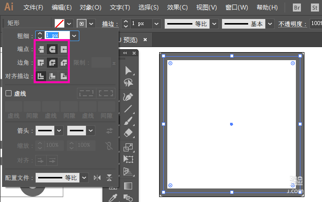 2、描边模式下,【矩形】工具绘制正方形,描边属性如图所示