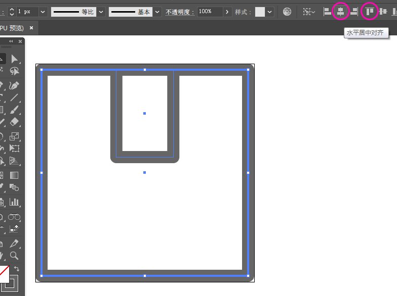 4、选中两个矩形,然后点击一下外面的正方形作为关键对象,顶部对齐菜单选择“水平居中对齐”“垂直顶部对齐”