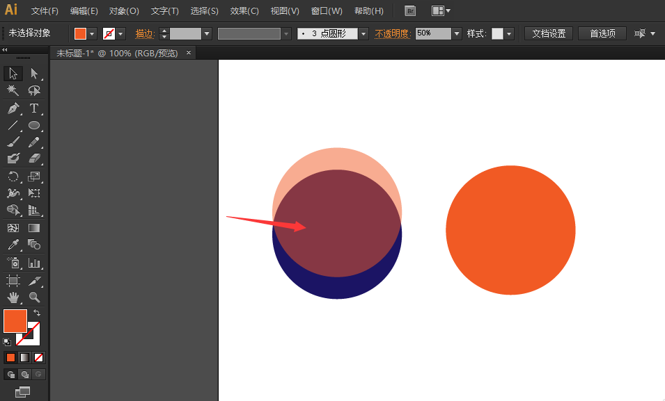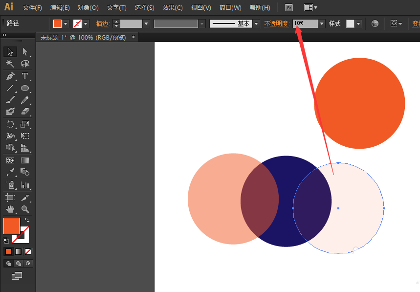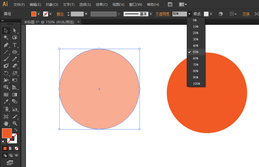 3、选中第一个圆,在上面有一项是“不透明度”,请点击其下拉三角,在下拉菜单中选择一个不透明度值(这里以50%为例)。显然,被选中的圆颜色淡了很多。